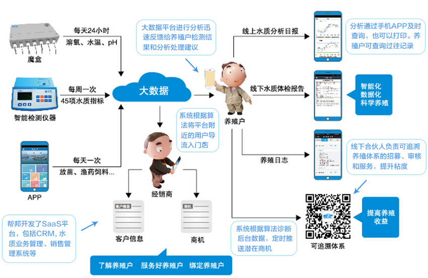 帮邦水产平台结合移动互联网与大数据分析,开发了智能手机APP,让从业者能通过手机即可完成水质体检、疾病诊断、测水配肥计算、养殖档案记录及管理等系列功能,实现养殖过程监控,洞察水质变化,分析养殖状态,掌控养殖成本。通过大数据分析和自动化服务平台,帮邦水产还可及时提供个性化的天气、水质、疾病预警,降低养殖风险,提高养殖收益。